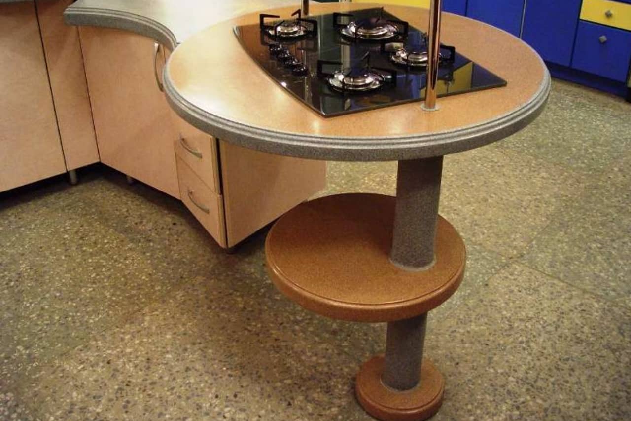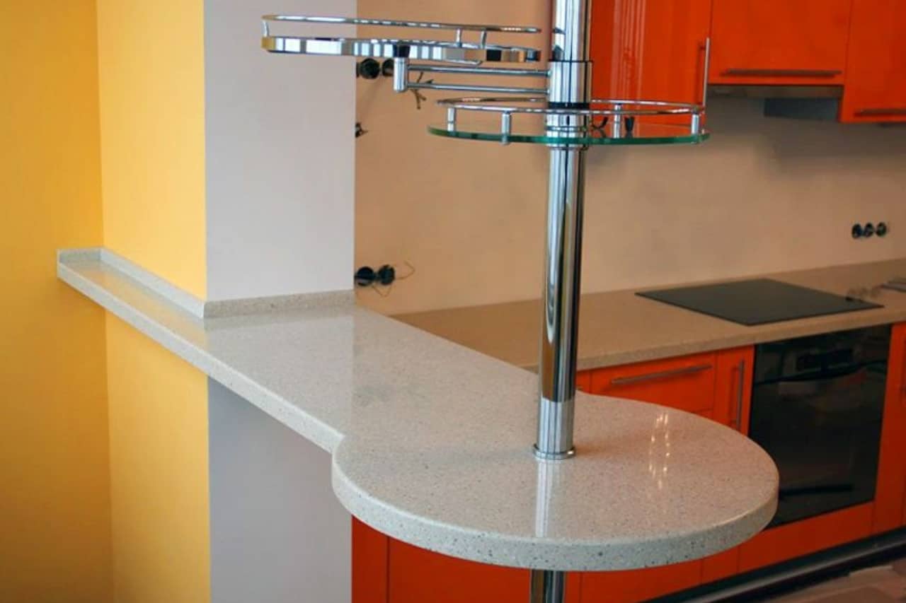 Барные стойки для кухни из искусственного камня могут иметь абсолютно любые форму, цвет и стоимость. Полет фантазии заказчика не ограничивается благодаря уникальной структуре искусственного камня, которая в процессе обработки может приобретать разнообразный вид.