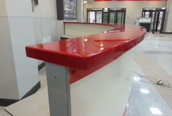 Поверхность устойчива к механическому воздействию, влаге, краткому влиянию высоких температур. Отсутствие пор в мебели придает ей высокую степень экологичности и безопасности — на поверхности стоек не образовывается плесень и грибок.
