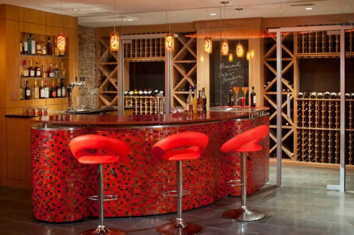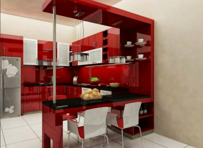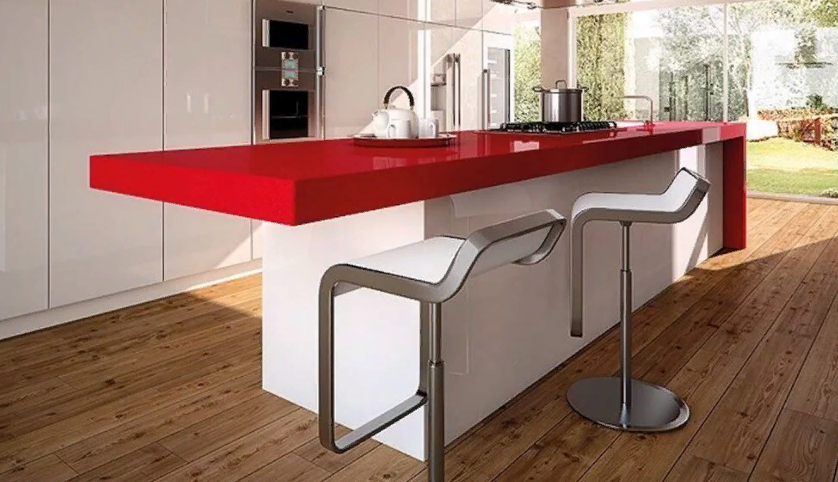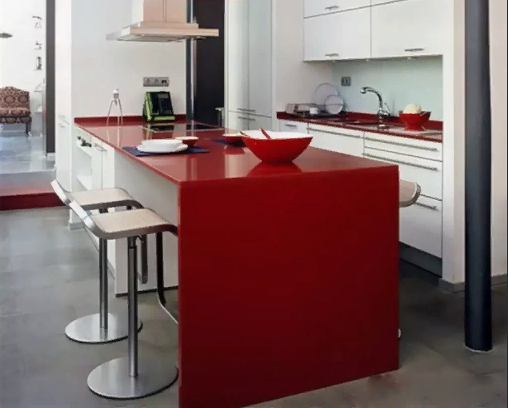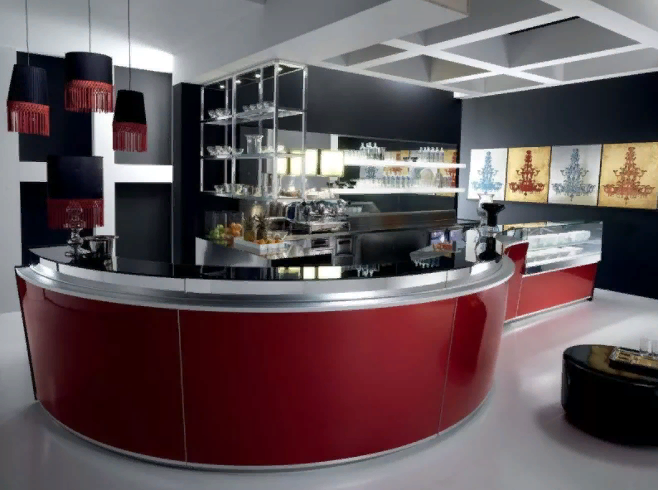 Барная стойка красного цвета станет ярким элементом интерьера кухни, гостиной или ресторана в стиле хай-тек или индастриал. Технологические особенности создания мебели позволяют использовать при производстве любые цветовые пигменты. Вы можете заказать стойку любого оттенка и формы.