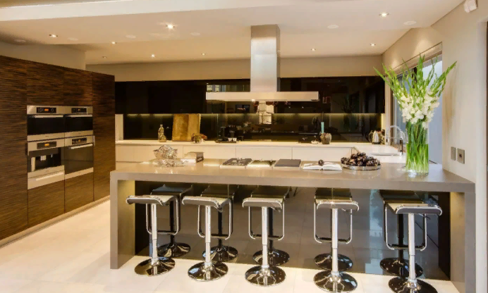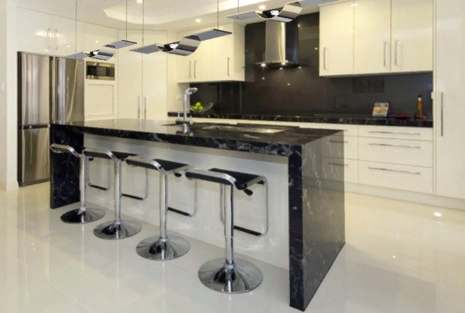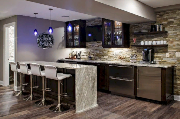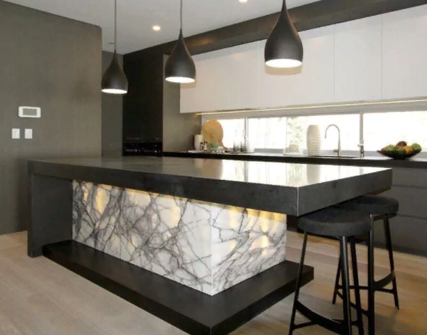 Барная стойка в стиле модерн производится из камня, придающего прочность и долговечность конструкции. Поверхность влагоустойчива. Пролитая жидкость не впитывается, что не позволяет бактериям и грибку размножаться и вредить здоровью человека.