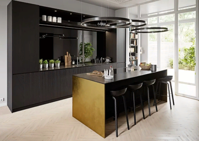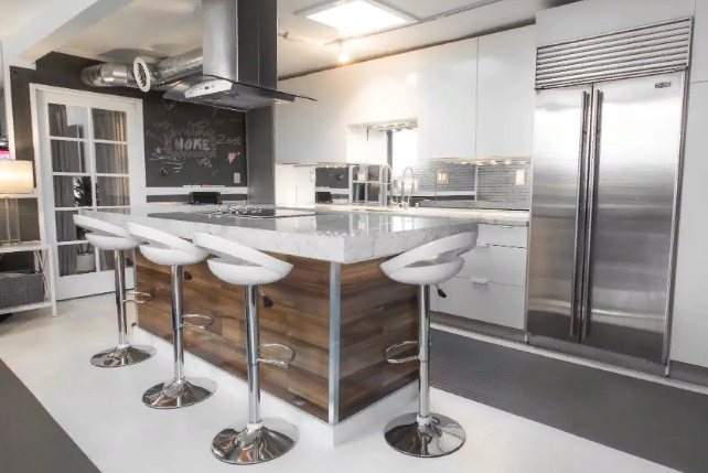 Островная барная стойка — компактный и удобный вид мебели. Ее устанавливают в просторных гостиных или кухнях. Используют в качестве небольшого стола и дополнительного места хранения посуды и других предметов.