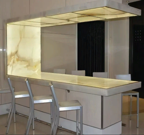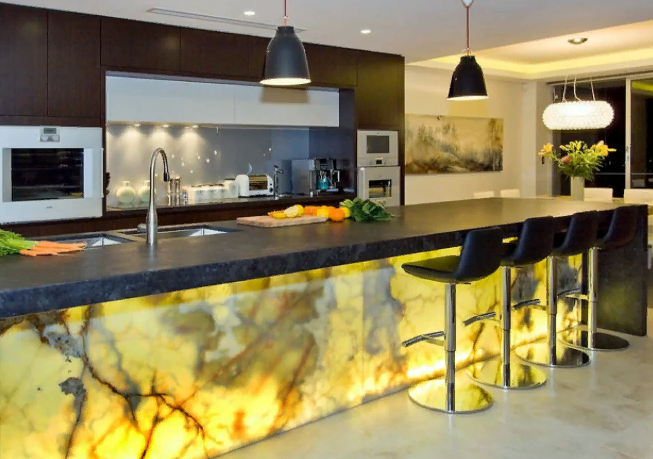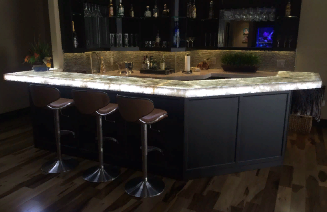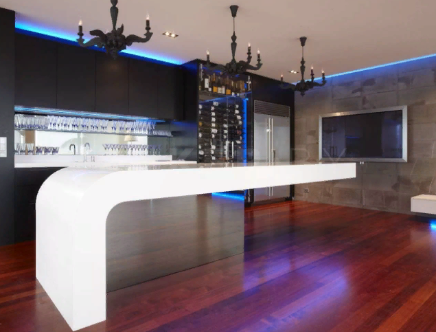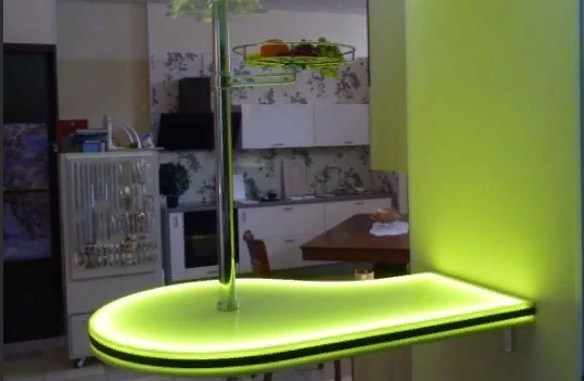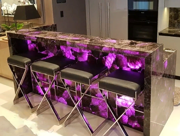 Светящаяся барная стойка из камня устанавливается в барах, ресторанах и ночных клубах. Но может быть и частью интерьера загородного дома или квартиры в современном стиле или хай-тек. Свечение обеспечивается применением светодиодов при производстве конструкций.