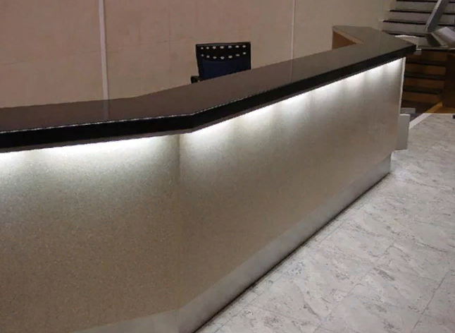 Стойки с подсветкой могут быть выполнены различных форм, даже самых замысловатых. По цвету и размерам также не существует ограничений. Благодаря гибкости композитного материала, возможно исполнение практически любых желаний заказчика. Прочный и долговечный искусственный камень долго сохраняет привлекательный внешний вид.