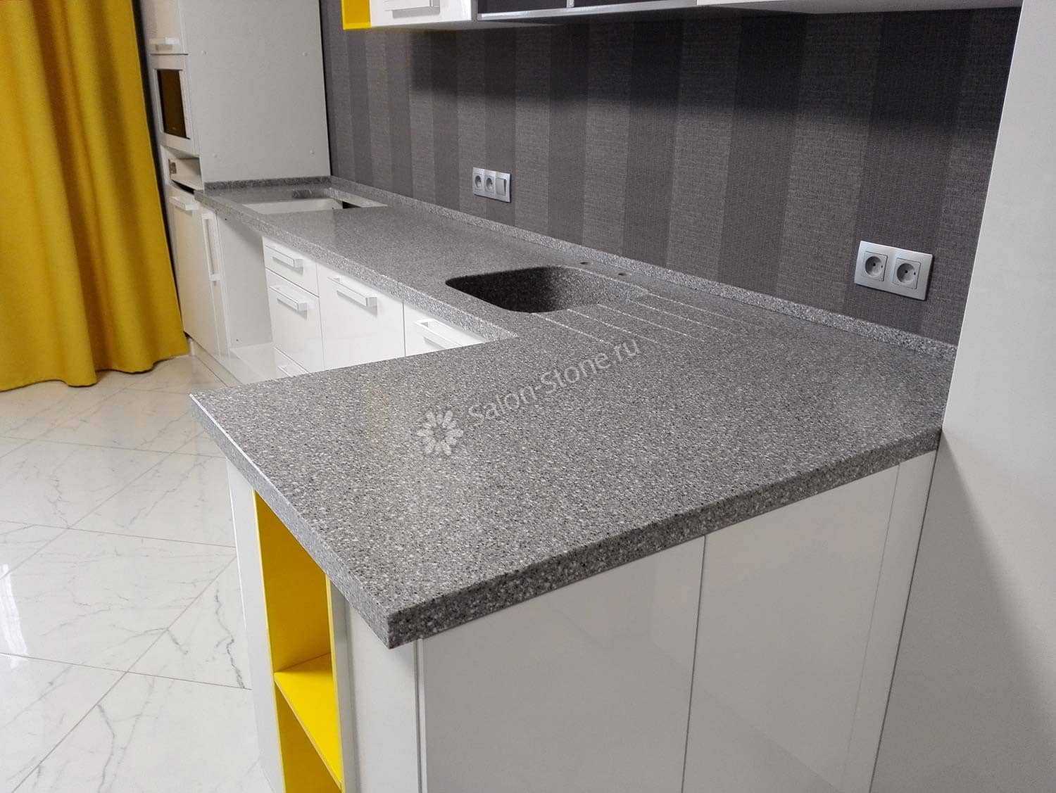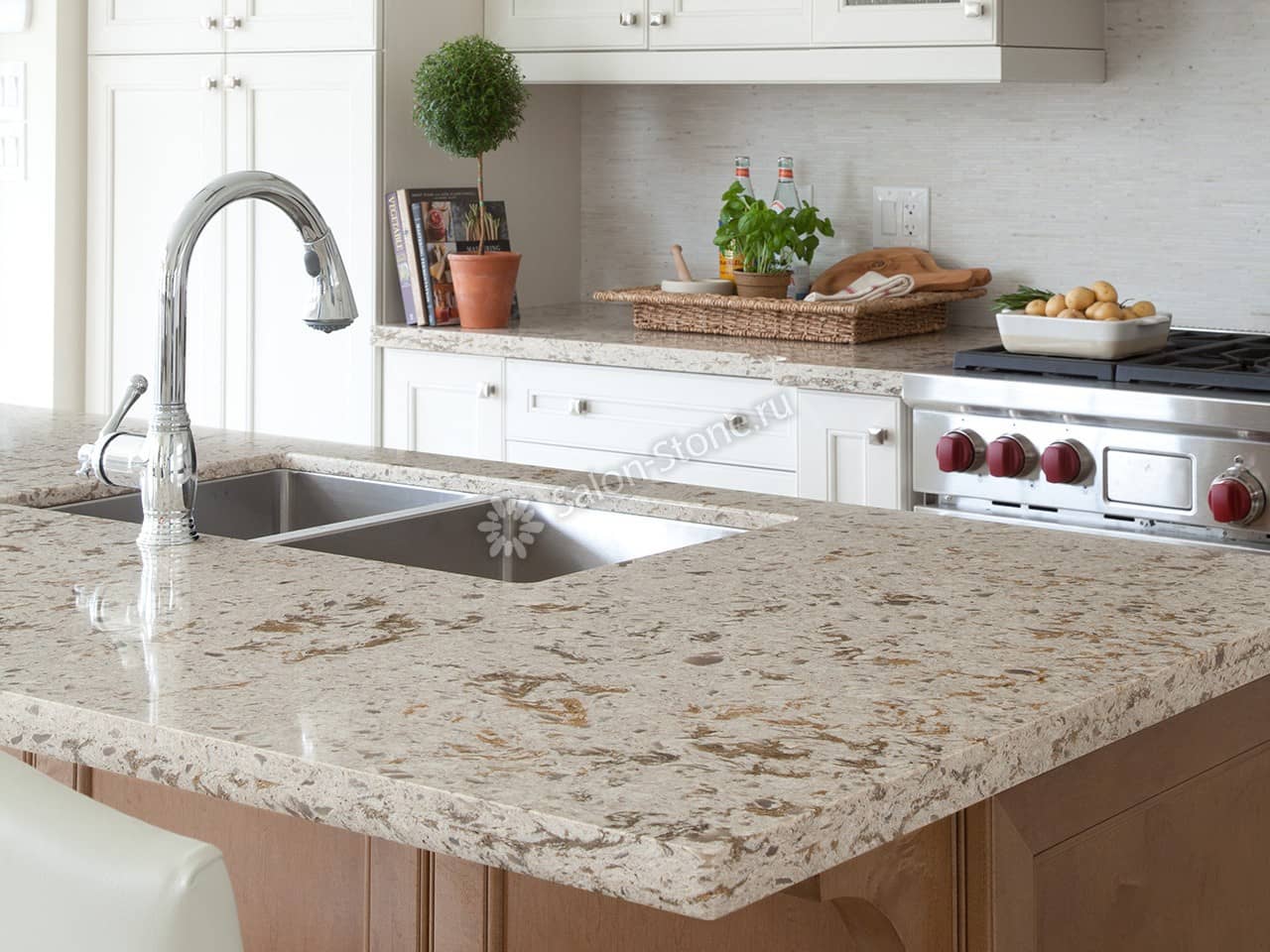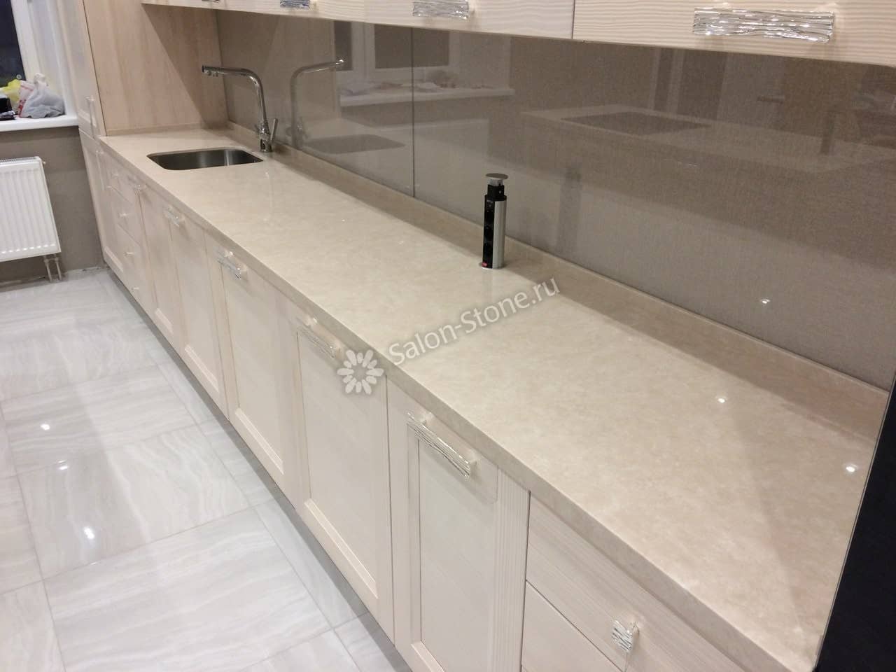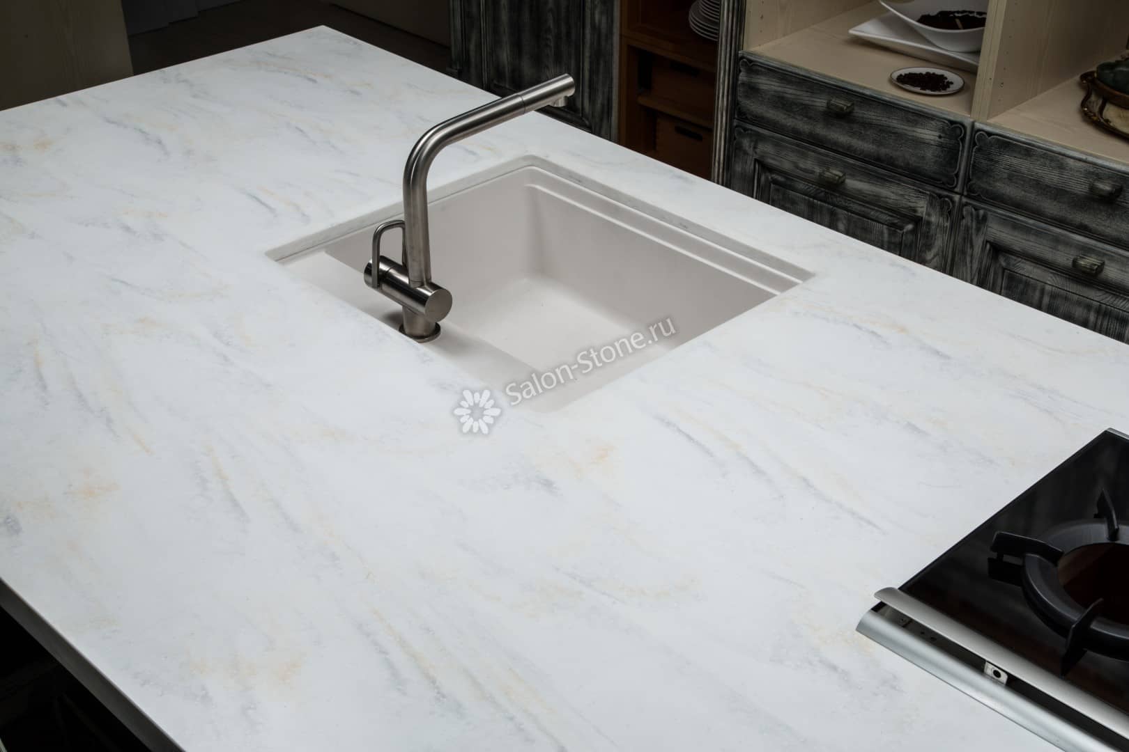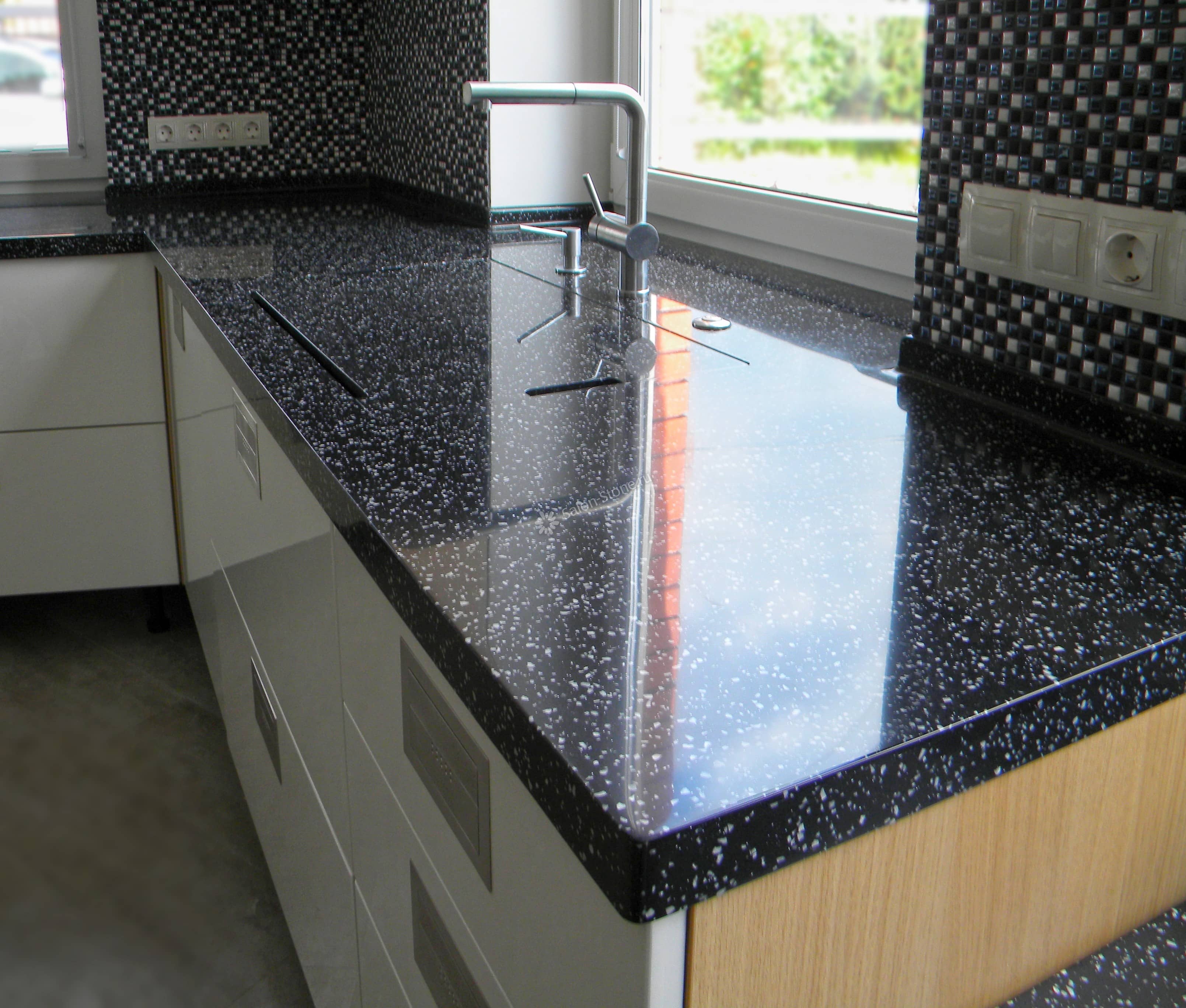 При этом искусственный камень лишен недостатков натурального: он не дает сколов и трещин, не реагирует на перепады температур и солнечные лучи, не впитывает воду и не создает питательной среды для бактерий. Такая рабочая поверхность гигиенична и долговечна.