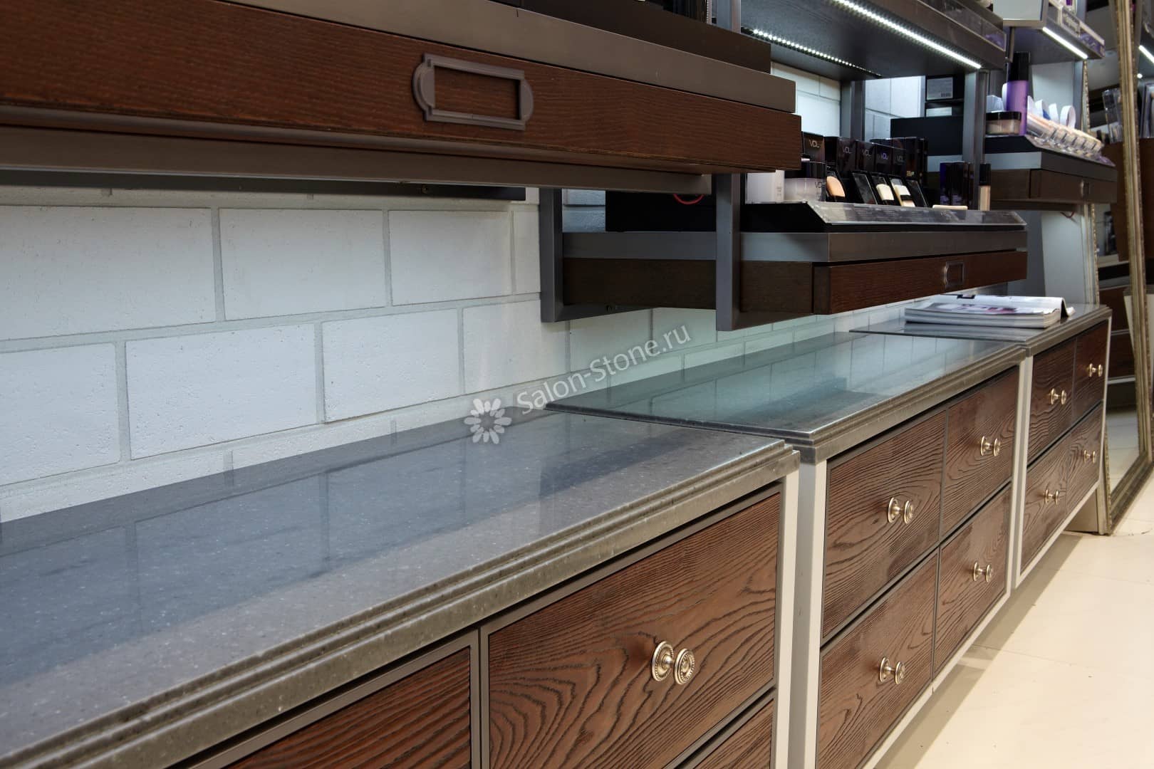Говоря о минусах такого материала, можно отметить только тяжелый вес и невозможность создания нестандартных форм. В отличие от акрила, кварц плохо поддается обработке. Поэтому из него делают только геометрически правильные изделия (квадратные либо прямоугольные).