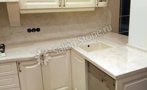 Хотите без чрезмерных затрат добавить роскоши в интерьер кухни? К вашим услугам – столешницы из искусственного камня под мрамор. Композитный материал намного дешевле, а выглядит ничуть не хуже. Производителям удается добиться поразительной схожести с природным мрамором за счет фактурной поверхности с различными включениями.